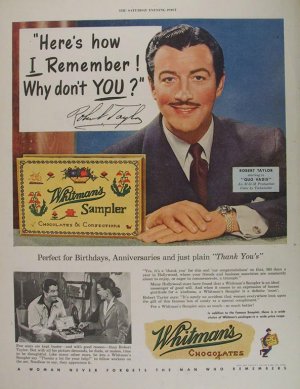 Photo caption: Few stars are kept busier—and with good reason, than Robert Taylor. But with all his picture demands, he finds, or makes, time to be thoughtful. Like many other stars, he lets a Whitman’s Sampler say “Thanks a lot for your help!” to fellow workers on the set. Needless to say, they appreciate it.
