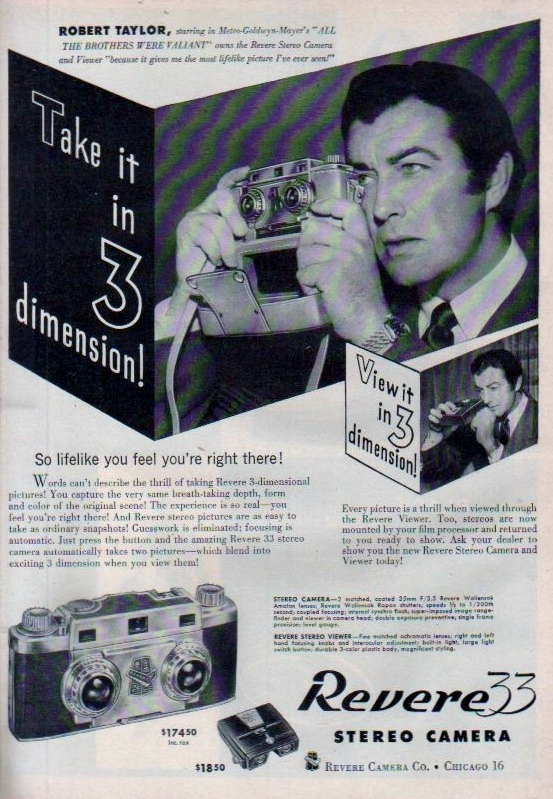 Robert Taylor, starring in MGM’s All the Brothers were Valiant, uses the Revere Stereo Camera and viewer “because it gives me he most lifelike picture I’ve ever seen.”
