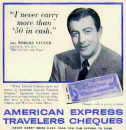 When I travel, I always carry my money in American Express Travelers Checks. Then I know it’s safe. Spendable anywhere, good until used, prompt refund if lost or stolen. Buy them at your Bank, at Railway Express and Western Union Offices. Charges, only a penny a dollar. Bob Hope.