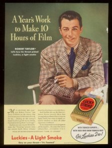 My 8 pictures this year, says Robert Taylor, “run about 10 hours on the screen. But that meant over 2000 hours of work for me….During all this acting I found Luckies gentle on my throat. I started smoking them 7 years ago.”