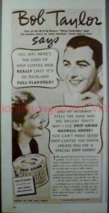 Another no-brainer. Robert Taylor lived with a large thermos of coffee. It came to work with him, took car trips with him, flew to distant locations with him. There are dozens of photos of gorgeous ladies–Deborah Kerr, Ava Gardner, Liz Taylor etc.–sharing the contents of the thermos. Around 1960 Robert and Ursula Taylor made a TV commercial for Maxwell House. I believe it first ran during “The Detectives.” You can find it on You Tube.
