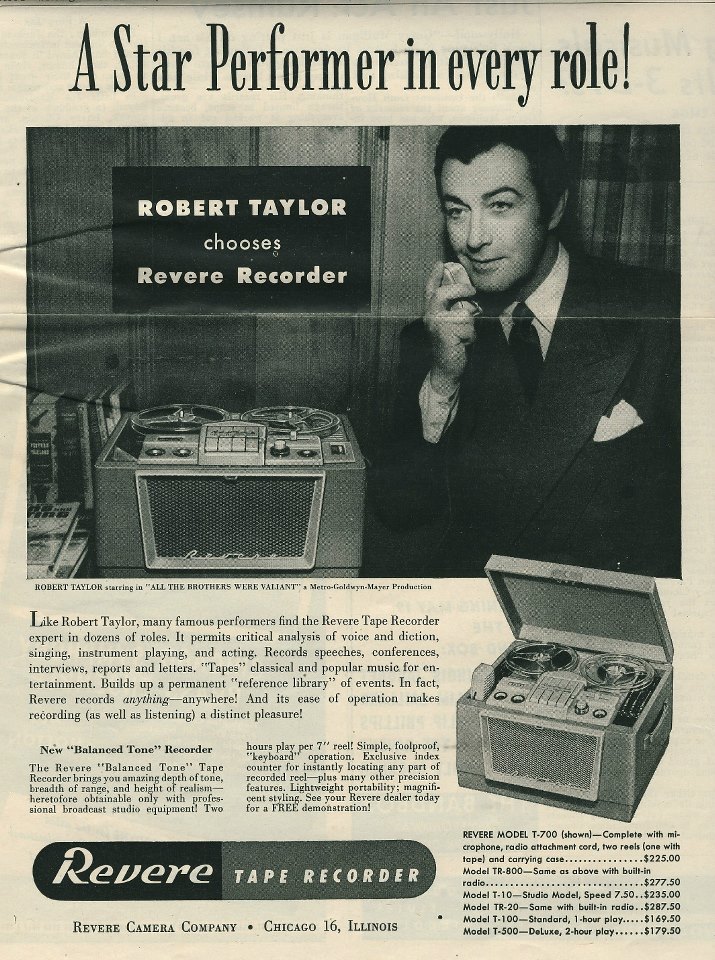 Revere strikes again with an expensive tape recorder–$225 was a lot of money in 1953. The ad reads:
