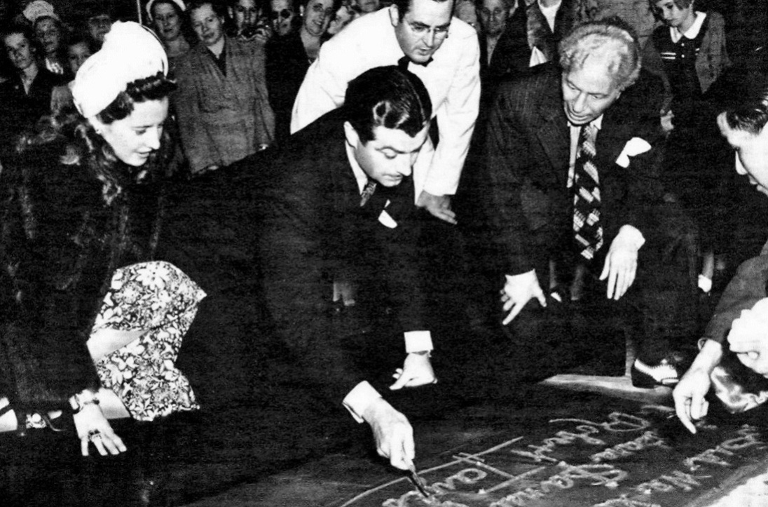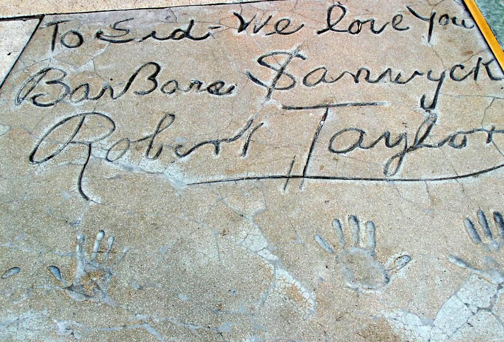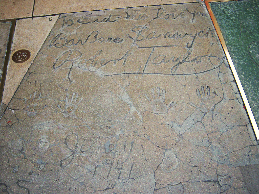 Robert Taylor and Barbara Stanwyck left their prints on June 11, 1941. Along with both of their hand and footprints, the block includes their signatures and the inscription “To Sid, we love you.”