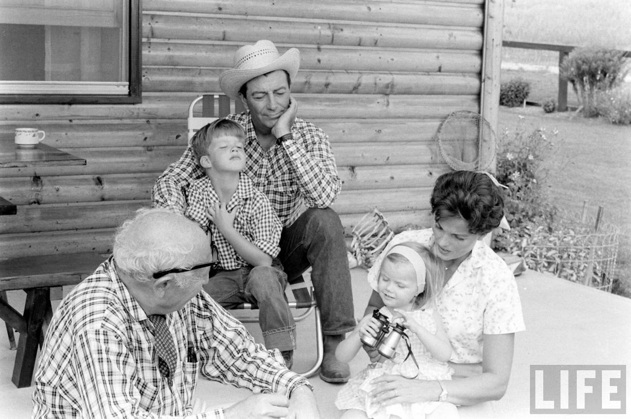 This picture shows the Taylor family and photographer Dmitri Kessel in Wyoming in 1961 during a photo shoot for Life Magazine. Ursula Thiess gave up her film career to be a wife and mother. Her relationship with her husband is best described in a passage from her book. The Taylors were in Cairo while he was making The Glass Sphinx. From Ursula Thiess, But I Have Promises To Keep: “When I arrived at the Nile Hilton, not expecting Bob to be at the hotel yet, I signed in and was ushered to the 9th floor. Simultaneously with the opening of the elevator, the last door on the long corridor opened as well, presenting a freshly showered, bathrobed Bob. I stopped and looked at him as he stood there, still 100 feet away, with a big smile on his face, his legs spread apart, cowboy-fashion, and his arms stretched out for an embrace. As my heart started pounding and the pit of my stomach knotted with excitement, I ran toward my husband like a 17-year-old, carried on the wings of first love. I felt an emotion of total commitment.”