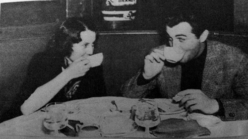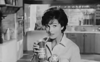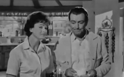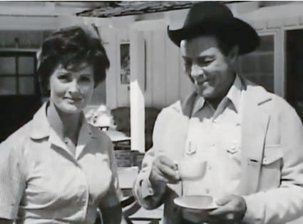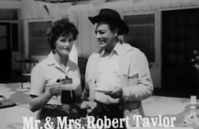 Around 1960 Robert Taylor and Ursula Thiess made a commercial for Maxwell House Instant Coffee. It ran regularly on his show “The Detectives” and probably other places. The commercial is charming. It starts with Mr. Taylor introducing his ranch and saying “we raise horses here.” He then joins Ursula for a cup of coffee. Mr. Taylor was, in fact, a dedicated coffee drinker and carried a thermos with him onto the set of his films.