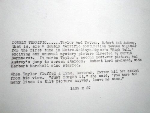 Audrey Totter and Robert Taylor did appear together in one film, High Wall, 1947. The film was a departure for both them from their usual roles. Mr. Taylor played a brain damaged World War II veteran who was committed to a mental institution after being accused of murdering his wife. Ms. Totter was his psychiatrist. At first she believes in his guilt and treats him like any other patient. Gradually things change and they become emotionally involved.