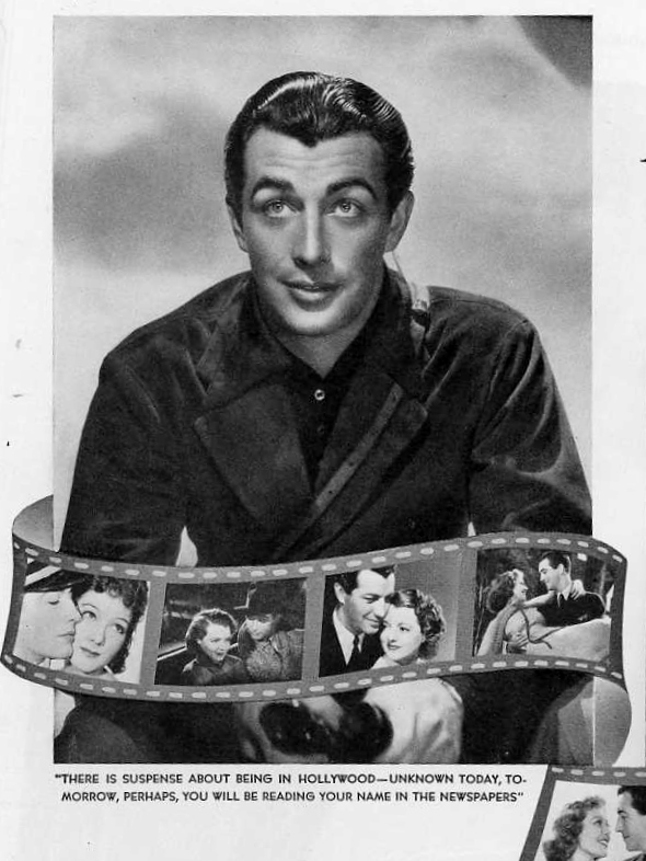 At Fox, I was a guest. I became a personality. My name had been changed. Anyone knows that S. Arlington Brugh could not go into lights over a theater, if it should deserve to get there. The studio had suggested Geoffrey Taylor. I had kicked about that, knowing I would be called Geoff. Robert mean Bob, which was common but comfortable. A new name, a new place to work—a feeling of self-confidence. When Will Rogers patted my back or threw his arms around my shoulders, I straightened and wondered what the fellows back home would think if they could see it! And people did talk to me at this studio. Even Janet Gaynor and Warner Baxter! I began to have the feeling I have today about a studio; it is a big campus where everyone knows you and you know everyone; a place in which you work, but where you also have fun. You see, I had a recommendation at Fox. I was that “new guy, Robert Taylor, loaned to us by Metro.” My studio was my letter of introduction into the fraternal organization of another lot.