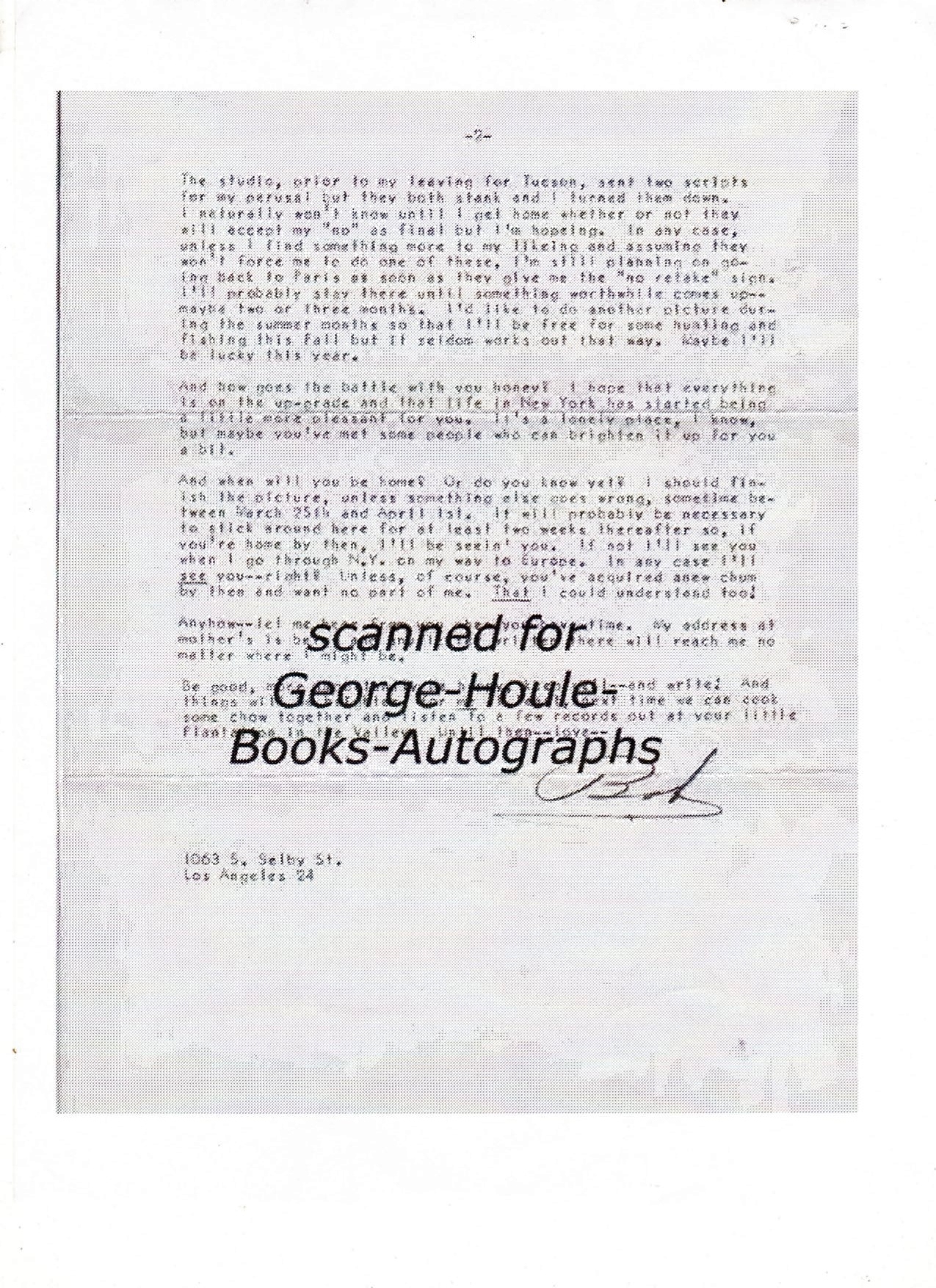 The studio, prior to my leaving for Tucson, sent two scripts for my perusal but they both stank and I turned them down. I naturally won’t know until I get home whether or not the will accept my “no” as final but I’m hoping. In any case, unless I find something more to my liking and assuming they won’t force me to do one of these, I’m still planning on going back to Paris as soon as they give me the “no retake” sign. I’ll probably stay there until something worthwhile comes up—maybe two or three months. I’d like to do another picture during the summer months so that I’ll be free for some hunting and fishing this Fall but it seldom works out that way. Maybe I’ll be lucky this year.