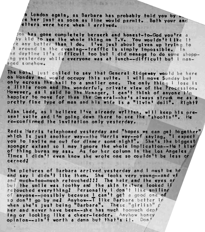 This letter has bits and pieces missing but none the less reflects an interesting moment in history.  The Coronation of Queen Elizabeth II was on June 2, 1953 and this letter was written days before that.  Among other things Mr. Taylor mentions that he is losing his hotel suite on the processional route and has to rely on the generosity of Alan Ladd to see the festivities. The recipient of the letter was publicist Helen Ferguson.