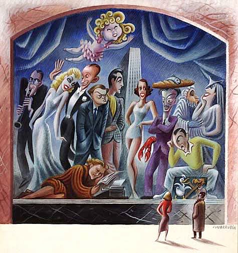 The following is a caricature by Mexican painter and illustrator Miguel Covarrubias, published in 1953 in Vanity Fair. The people are (left to right): Benny Goodman, Ginger Rogers, Fred Astaire, Orson Welles, Robert Taylor, Lily Pons, Salvador Dali, Alfred Lunt, Lynn Fontaine