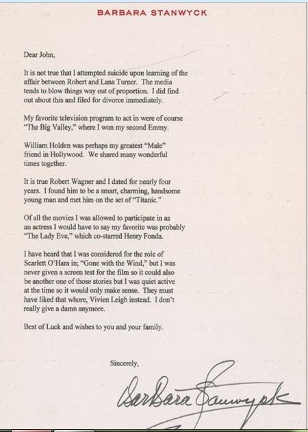 The letter from Barbara is very obviously a fake. She would never ever say such things in a letter to anyone, much less in what seems to be a fan letter. It gets basic facts wrong; like you mentioned, it was 10 years after the Lana Turner affair (if that’s what it was) that Barbara filed for divorce. She never admitted the Robert Wagner affair publicly. She would NEVER have called Vivien Leigh a whore; she only knew her through her work with Bob. The incident where she hurt her hand happened in 1939, as is documented in the Victoria Wilson biography, so the timing is all wrong for it to have been a suicide attempt because of Lana (which is highly doubtful in any case). Lastly, the letter looks like one that was produced by a word processor, i.e. software like Microsoft Word; it doesn’t look like a letter composed on a typewriter.