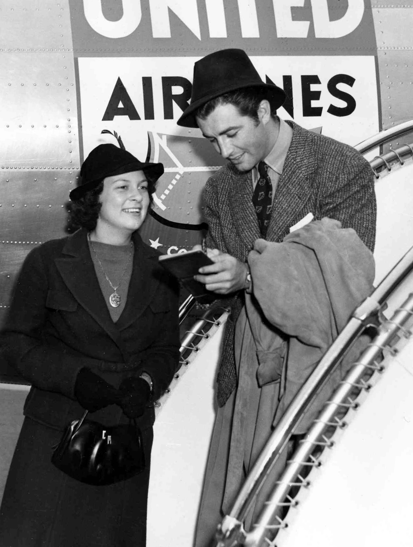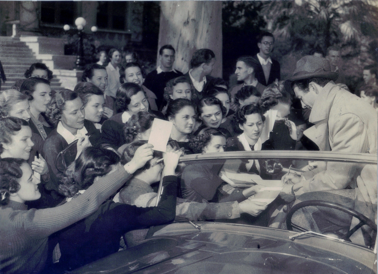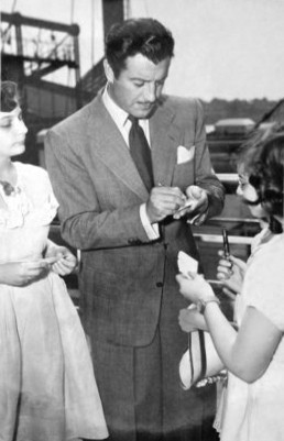 Although it was a nuisance at times to be mobbed by fans and to be asked for autographs, Robert Taylor was fully aware that without fans there were no stars. He always obliged fans to the fullest extent possible. From left: Disembarking from a plane; young lady fans; chatting with fans.