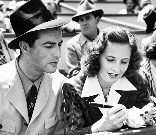 Barbara Stanwyck and Robert Taylor frequently met fans together. From left: The couple at a public event; autographing a baseball.