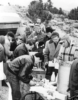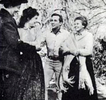 Left to right; with Ursula Thiess, Terry and Tessa Taylor on the set; taking his place in the chow line like anyone else; with Maggie Pierce, Robert Ivers and Virginia Christine.