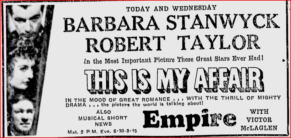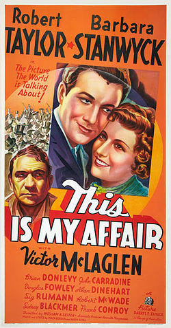 For a young man whose face is his fortune and who hitherto has starred as the answer to a maiden’s prayer, Robert Taylor shows surprising ability to act in the tense drama and poignant tragedy of Twentieth Century Fox’s His Affair [later This Is My Affair], even more so perhaps than in those romantic scenes of love where he is so seasoned and polished a performer.
