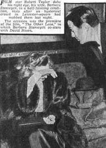 Ms. Stanwyck and Mr. Taylor after escaping from an hysterical crowd at the premiere of “The Other Love,” 1947.