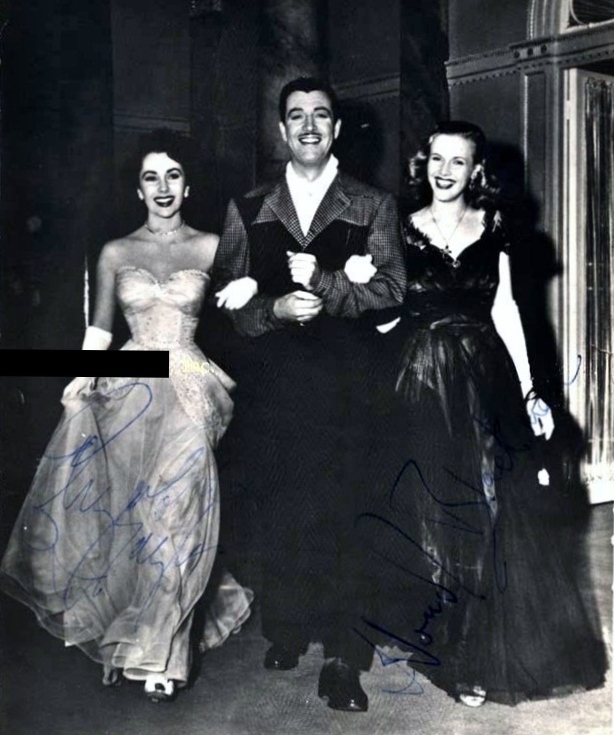 Left to right: Robert Taylor with a gun; the Taylors with a guest on the set; Liz Taylor, Robert Taylor, Honor Blackmun; Mr. Taylor’s admiration for Ms. Taylor was such that he requested to be photographed only from the waist up.