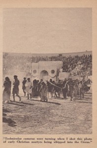 Still awed by the pomp and ceremony of the Roman era on which the sets are based, Bob couldn’t resist bringing Screen Guide readers photos of the costumes and spectacular sets used in Quo Vadis.  He snapped the circus  of Nero set, too, where Christians of that day were tortured before being put to death.  More than 6,000 Italian extras were employed to appear in this big scene and Bob tells us that the lions, fighting bulls and cheetahs were actually imported from Africa and especially trained for their roles in the Metro picture.