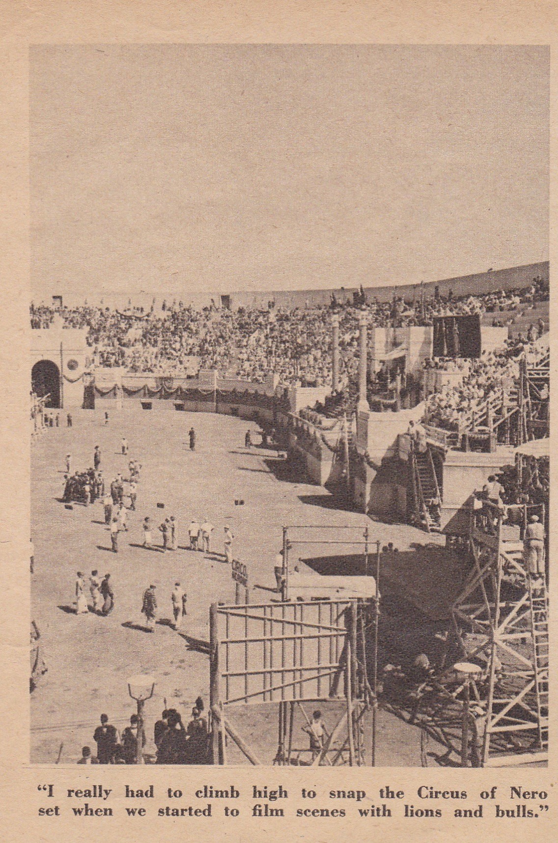 Still awed by the pomp and ceremony of the Roman era on which the sets are based, Bob couldn’t resist bringing Screen Guide readers photos of the costumes and spectacular sets used in Quo Vadis.  He snapped the circus  of Nero set, too, where Christians of that day were tortured before being put to death.  More than 6,000 Italian extras were employed to appear in this big scene and Bob tells us that the lions, fighting bulls and cheetahs were actually imported from Africa and especially trained for their roles in the Metro picture.