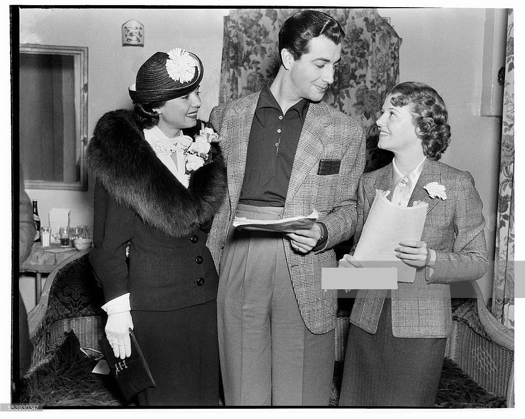 Left to right: Robert Taylor and Janet Gaynor taking a break on the set; filming a scene; Taylor and Gaynor with singer Frances Langford.