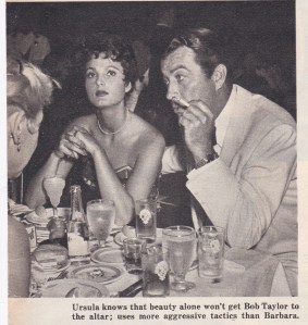 Lovely Ursula Thiess herself would be the first to tell you that beauty alone isn’t enough, these days, to get a beau to the altar. And Bob Taylor–handsome, sought-after, used to beauty and flattery–hasn’t been an easy man for any woman to land since his divorce from Barbara Stanwyck.