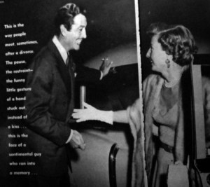 Text: This is the way people meet sometimes after a divorce. The pause, the restraint, the funny little gesture of a hand stuck out instead of a kiss. This is the face of an unsentimental guy who ran into a memory.