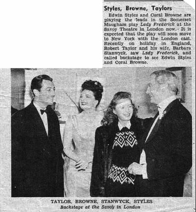 Text: Edwin Styles and Coral Browne are playing the leads in the Somerset Maugham play Lady Frederick at the Savoy theatre in London now. It is expected that the play will soon move to New York with the London cast. Recently on Holiday in England, Robert Taylor and his wife Barbara Stanwyck, saw Lady Frederick and called backstage to see Edwin Styles and Coral Browne. (probably 1947 or 1948).