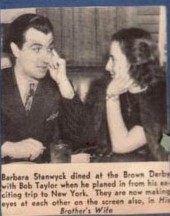 Text: Barbara Stanwyck dined at the Brown Derby with Bob Taylor when he planed in from his exciting trip too New York. They are now making eyes at each other on the screen also, in His Brother’s Wife.