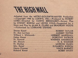 I believe that this is from a magazine called Screen Stories. There were changes made between this and the actual filming but it is pretty accurate. The biggest change is that the title of the film was changed from The High Wall to High Wall, which I actually think works better.
