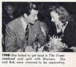 1948 She failed to get the lead in The Fountainhead and split with Warners. She and Bob were rumored to be separating.