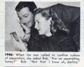 1944 When she was called to confirm rumors of separation, she asked Bob, “Are we separating, honey?” He answered, “not that I know of, darling.”
