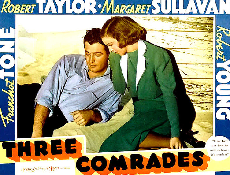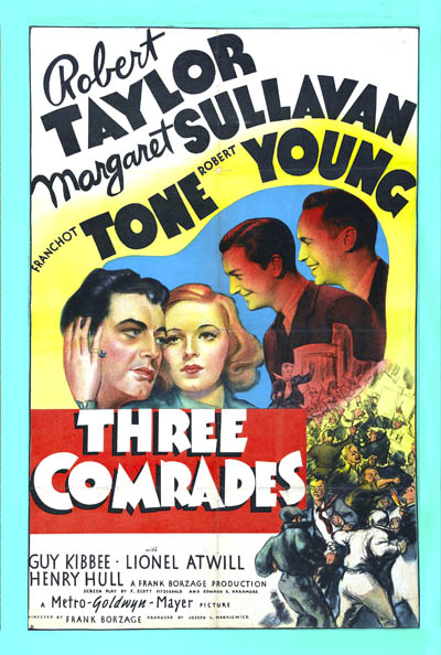 New York Times Review (summary): Based on a novel by Erich Maria Remarque, Three Comrades represented one of the few successful screenwriting efforts of F. Scott Fitzgerald. Set in Germany in the years just following World War I, the film stars Robert Taylor, Franchot Tone and Robert Young as three battle-weary, thoroughly disillusioned returning soldiers. The three friends pool their savings and open an auto-repair shop, and it is this that brings them in contact with wealthy motorist Lionel Atwill–and with Atwill’s lovely travelling companion Margaret Sullavan. Taylor begins a romance with Sullavan, who soon joins the three comrades, making the group a jovial, fun-seeking foursome Though Sullavan suffers from tuberculosis (her shady past is only alluded to), she is encouraged by her male companions to fully enjoy what is left of her life. This becomes increasingly difficult when one of the comrades, Young, is killed during a political riot (it’s a Nazi riot, though not so-labelled by ever-careful MGM). In the end, the four comrades are only two in number, with nothing but memories to see them through the cataclysmic years to come. Despite its Hollywoodized bowdlerization of the Remarque original, Three Comrades remains a poignant, haunting experience. ~ Hal Erickson, Rovi